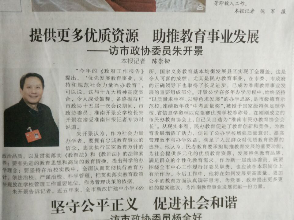 热烈祝贺淮南市政协委员朱校长专访在淮南日报头版刊出