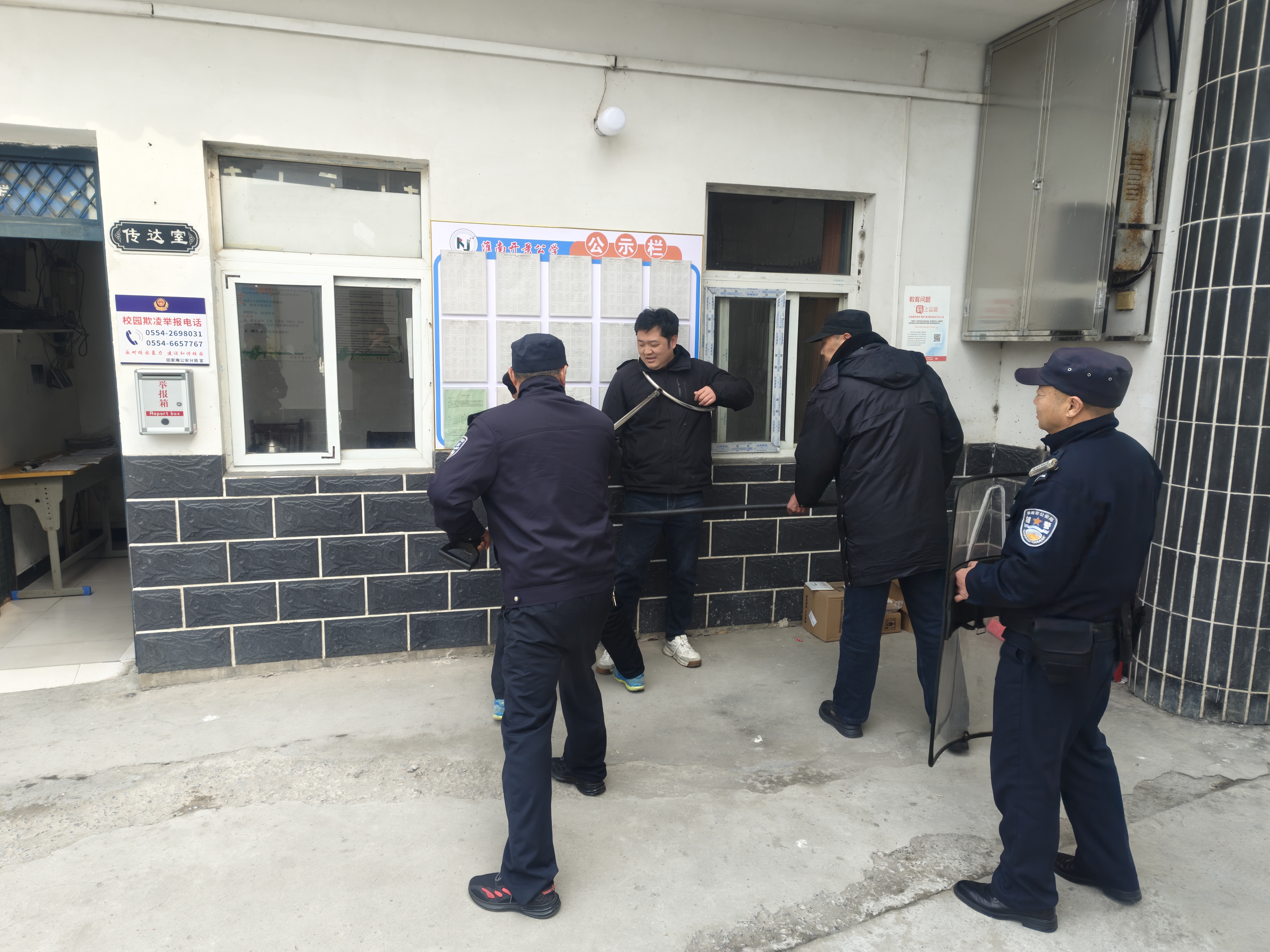 宣讲结束后,防爆应急演练随即展开。学校提前制定了详细的演练方案,明确了“发现险情—启动预案—协同处置”的全流程,侯警官现场对参与演练的年轻教师和保安进行了专项培训,讲解了防暴盾牌、钢叉等器械的使用技巧和协同攻防战术。